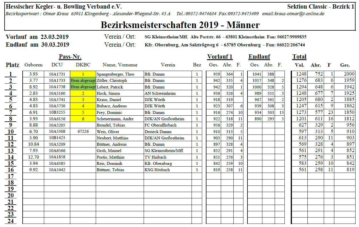 Bei der Herren konnten sich unsere Bundesligaakteure Christoph Zöller, Patrick Lebert (beide 942 Holz) und Theo Spangenberger (959 Holz) nach dem Vorlauf in Kleinostheim die Plätze 1 – 3 sichern. Dominic Frey konnte aufgrund einer Absage ebenfalls noch in den Endlauf nachziehen.